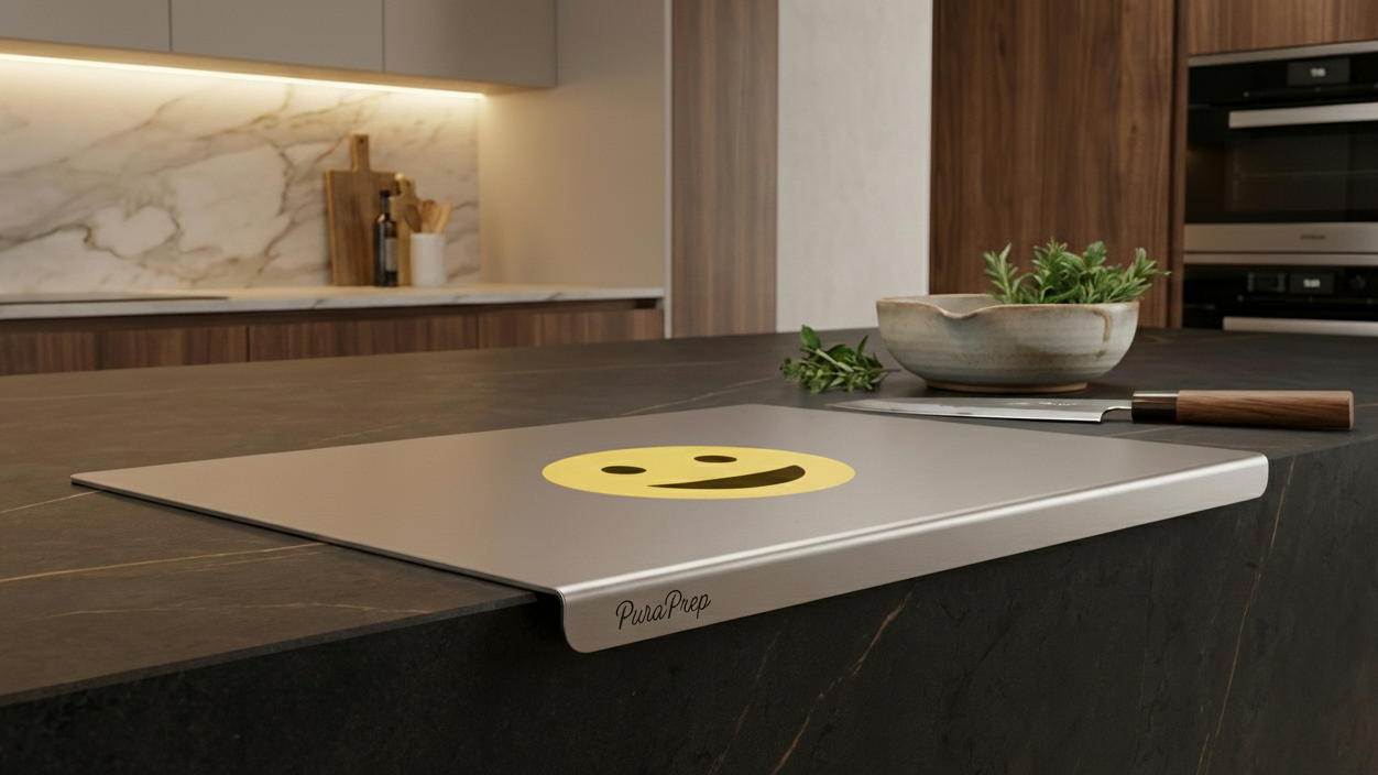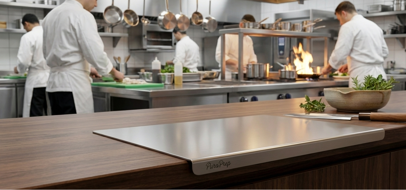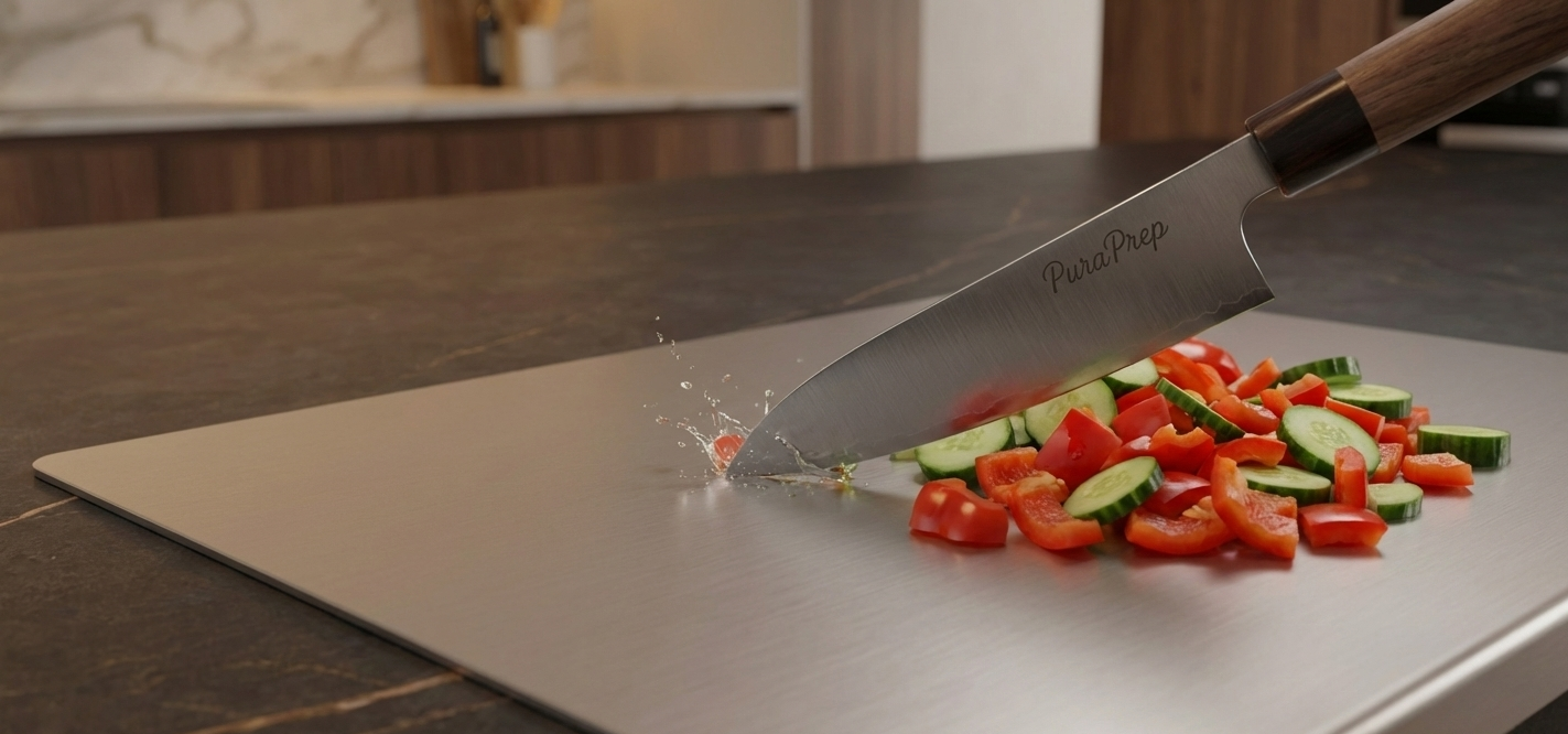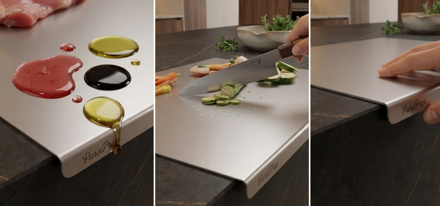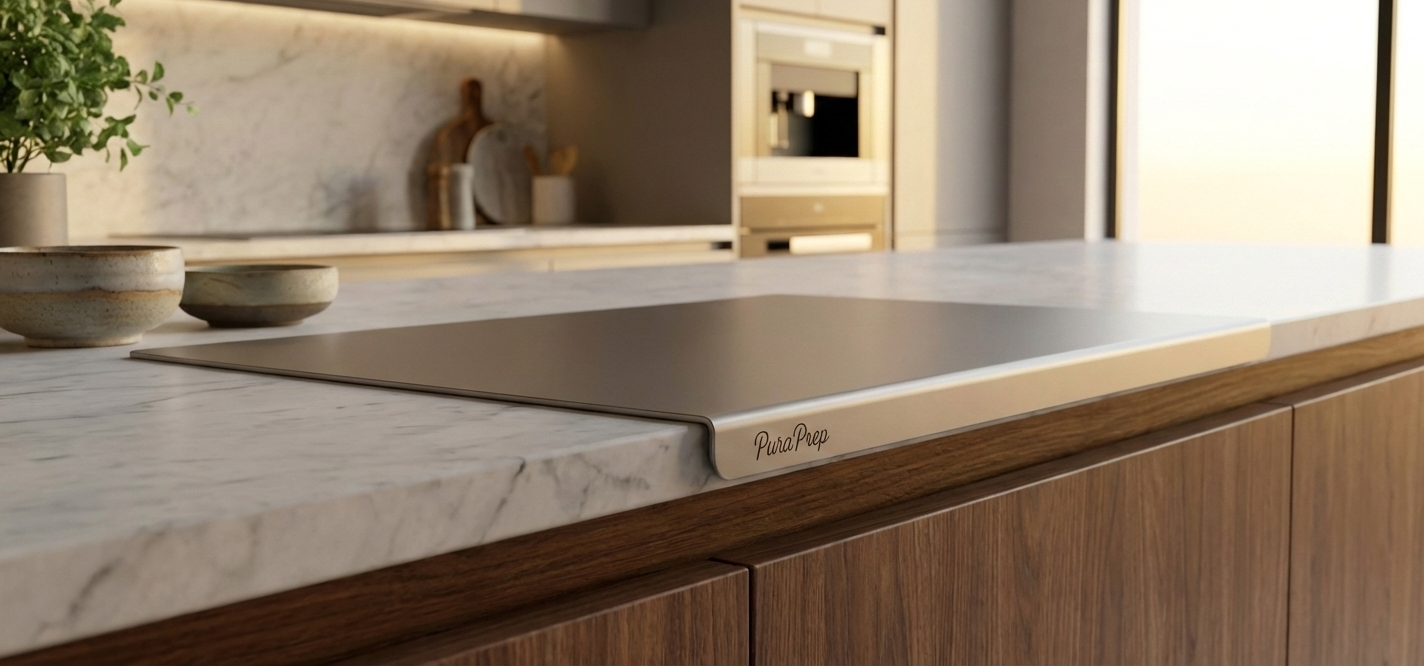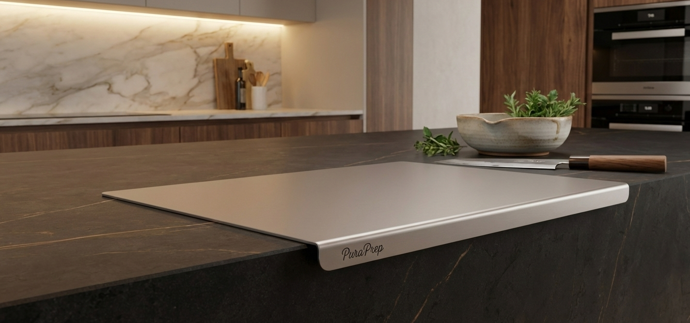 PuraPrep L-Shaped Stainless Steel Cutting Board. A premium, lifetime prep surface designed for the modern, health-conscious home.