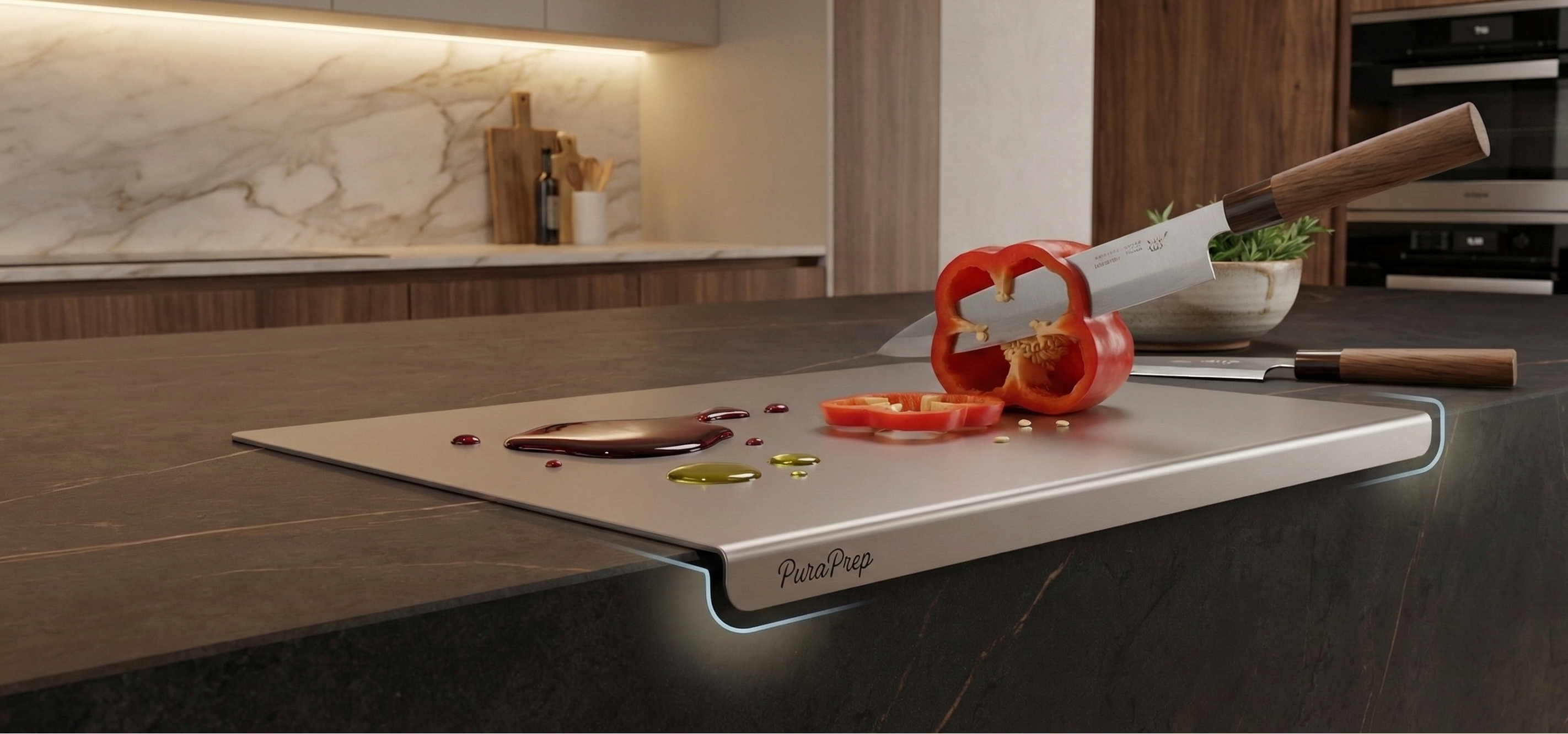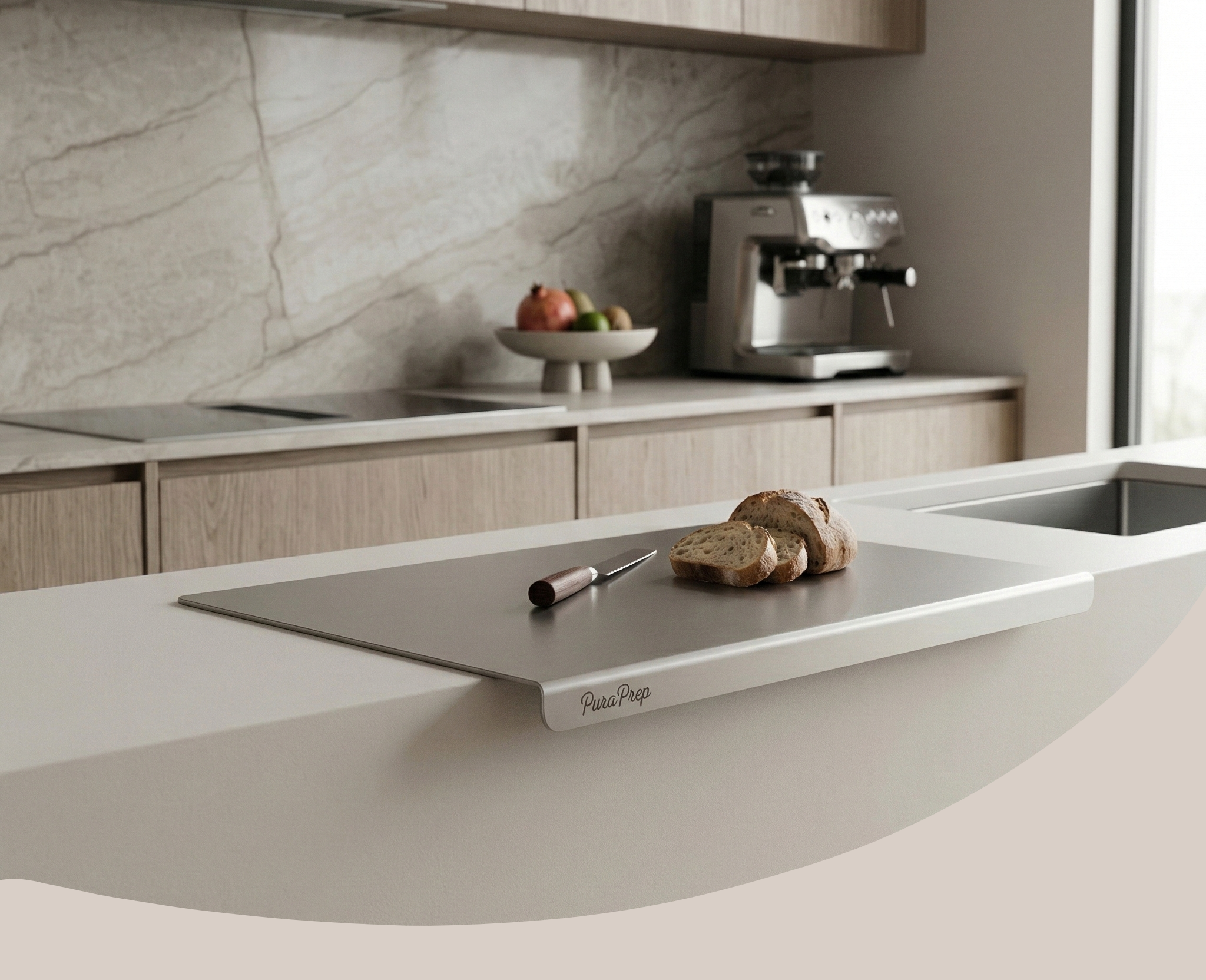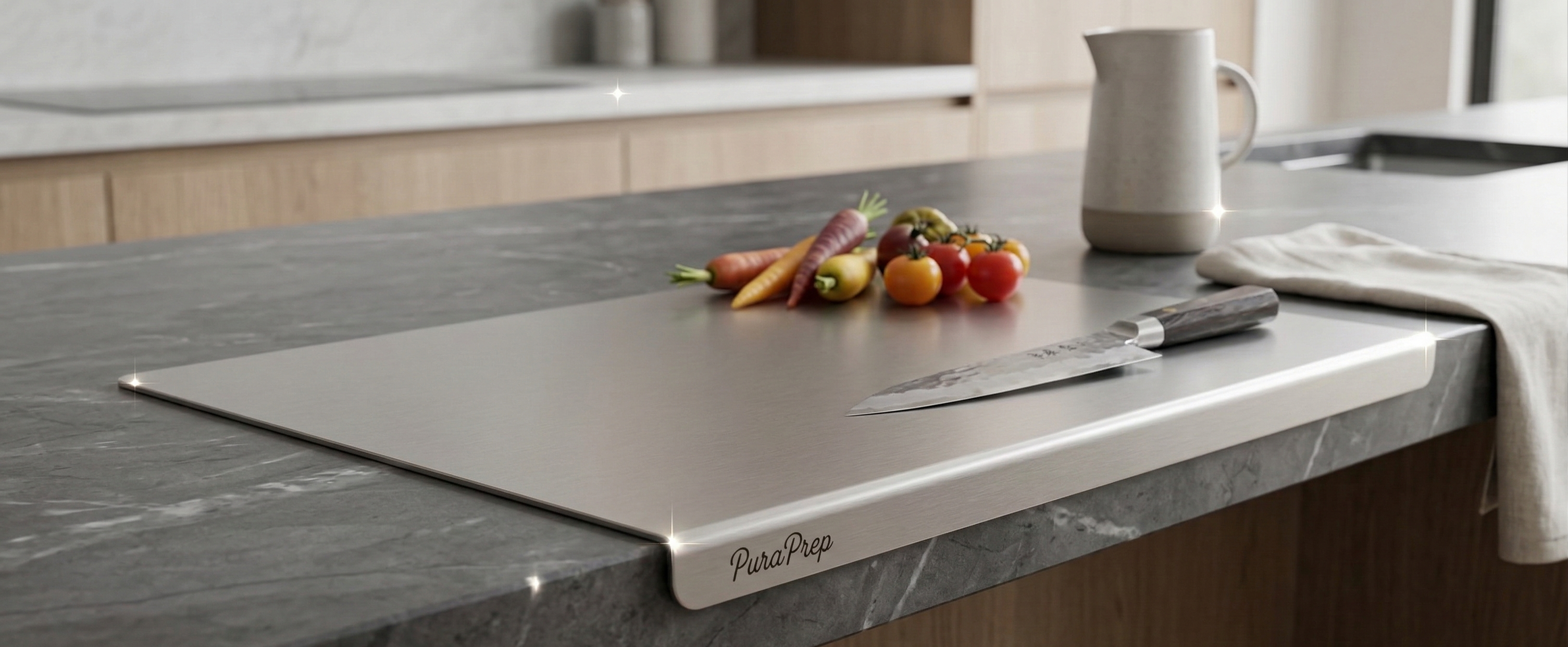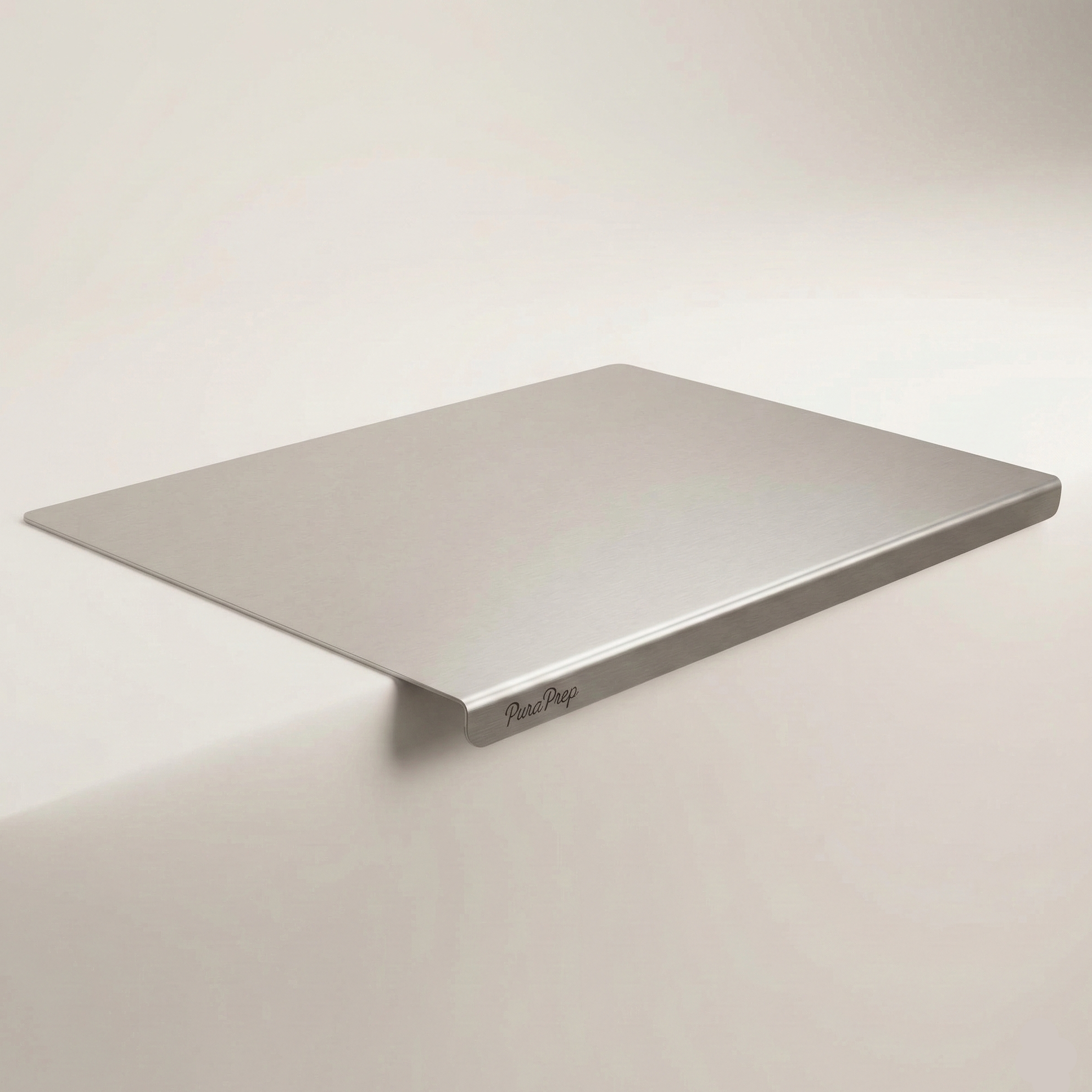 PuraPrep L-Shaped Stainless Steel Cutting Board. A premium, lifetime prep surface designed for the modern, health-conscious home.